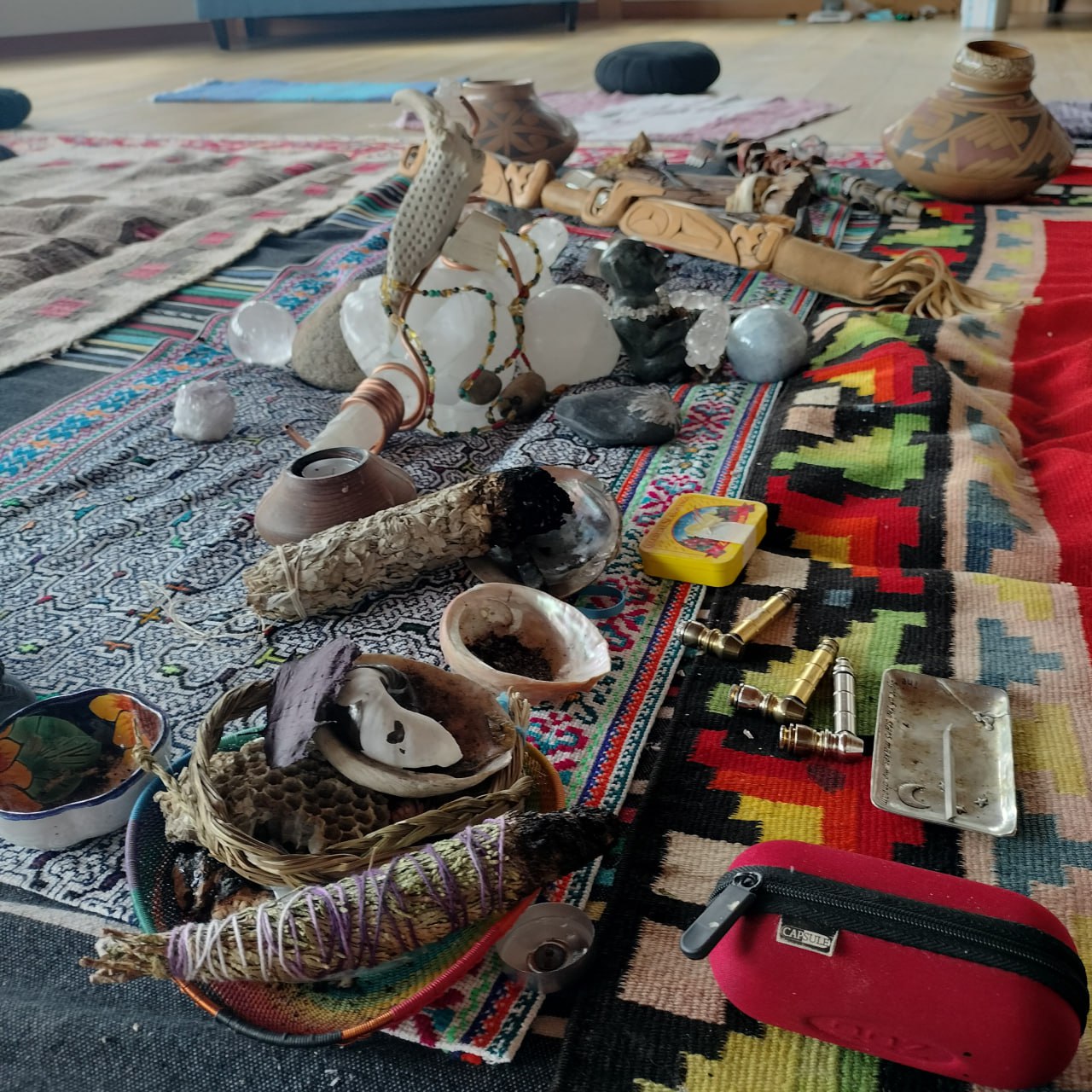 For some reason before we began I grabbed a rubbish bin and placed it next to where I was seated in the ceremonial space; while I’ve had the thought “what if I puke?” before, this was the first time I acted on the impulse. We started with smoking the tobacco pipe – I asked rather than he offered, as I saw him doing so for himself, in order to have the most ‘traditional’ experience. He asked me my intention and I said to experience methoxy in his manner, with no expectations attached. He explained the metal pipe + blowtorch method (which I grokked fairly quickly), and explained that he would wait for me to go in before dosing himself (at a much higher dose). He didn’t explain what he would do in the state, nor did I have a very clear model of what exactly I was in for. I was simply open to having a novel experience.
