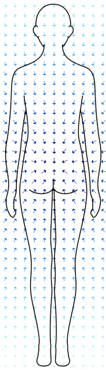 A conceptual frame I kept returning to throughout the retreat was vector field analysis, which was so useful because of its simplicity. At high doses of 5-MeO, there are few viable modes of phenomenological analysis other than merely observing the direction and magnitude of hypothetical nodes (vectors) dotted across the field of your experience, representing the behaviour of qualia at a very basic level. This is also useful because I observed consistent trends within such analyses that were associated with valence. Negative experiences contained critical points – regions within my experience where the vector field’s magnitude is zero (e.g., sources, sinks, saddles) relative to other regions. Positive experiences contained fewer differences between experiential regions – the more ‘smooth’ and ‘simple’ its topology, the better the experience felt.7 Below is a representation of what one of my negative experiences felt like within my body map (comprising the experience):
