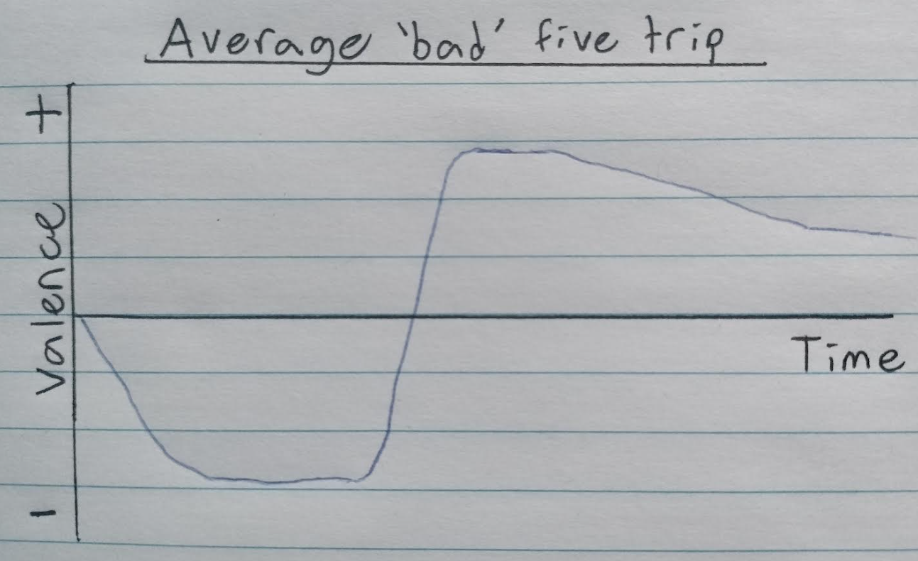 During these negative experiences I learned to stop whatever I was doing with my attention and just let go.15 Just let go! It sounds so easy, but as I discovered, trying to let go is a very different activity from actually letting go, which involves not trying anything whatsoever within your experience – including the action of letting go! The mental move involved in this process is so subtle that I would have to relearn it with every fresh 5-MeO session; an analogy can be drawn here with sleeping, where every night you have to relearn how to unclench that muscle which keeps us awake all the time. During difficult experiences, I would typically become aware of an unpleasant pattern (e.g., a thought process), then I would attempt to ‘unclasp’ my awareness from that pattern – including the awareness that I was even trying to let it go. Usually this would be sufficient to turn the valence from negative to positive prior to halfway through the peak. Here is a (crude) representation of the progression of such experiences: